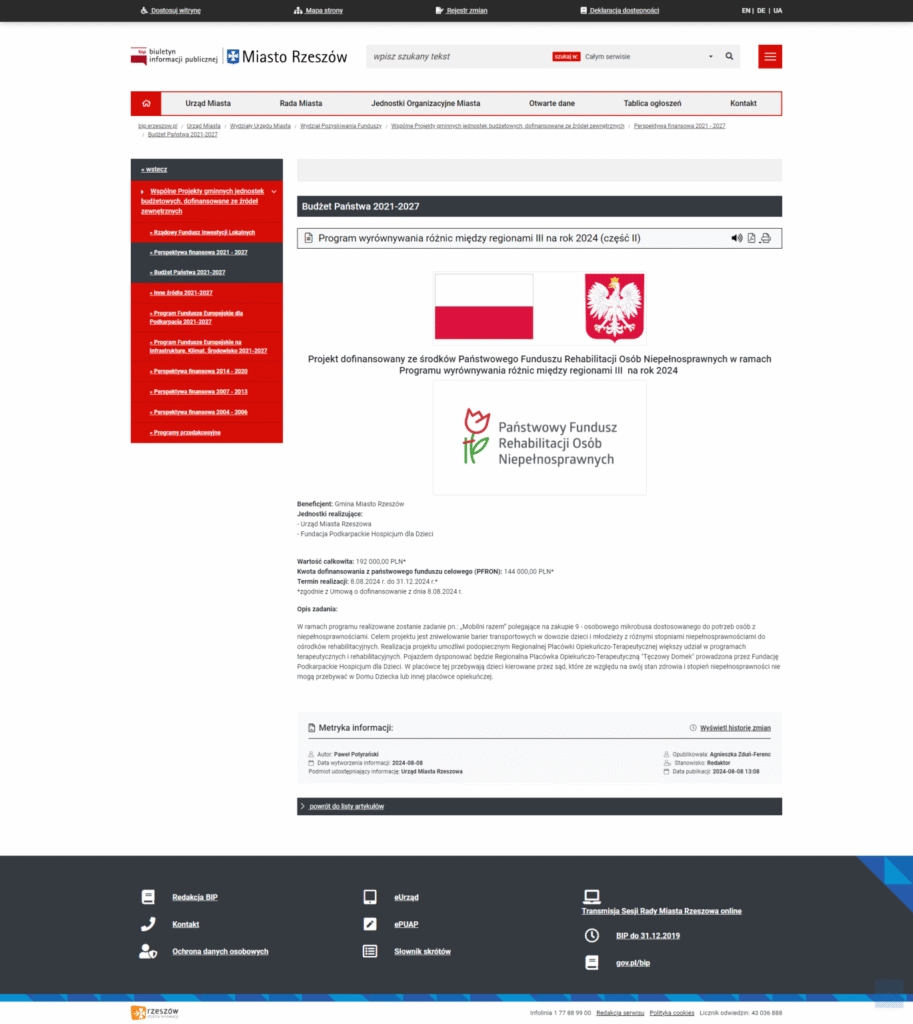 W ramach programu realizowane zostanie zadanie pn.: „Mobilni razem” polegające na zakupie 9 – osobowego mikrobusa dostosowanego do potrzeb osób z niepełnosprawnościami. Celem projektu jest zniwelowanie barier transportowych w dowozie dzieci i młodzieży z różnymi stopniami niepełnosprawnościami do ośrodków rehabilitacyjnych. Realizacja projektu umożliwi podopiecznym Regionalnej Placówki Opiekuńczo-Terapeutycznej większy udział w programach terapeutycznych i rehabilitacyjnych. Pojazdem dysponować będzie Regionalna Placówka Opiekuńczo-Terapeutyczną „Tęczowy Domek” prowadzona przez Fundację Podkarpackie Hospicjum dla Dzieci. W placówce tej przebywają dzieci kierowane przez sąd, które ze względu na swój stan zdrowia i stopień niepełnosprawności nie mogą przebywać w Domu Dziecka lub innej placówce opiekuńczej.