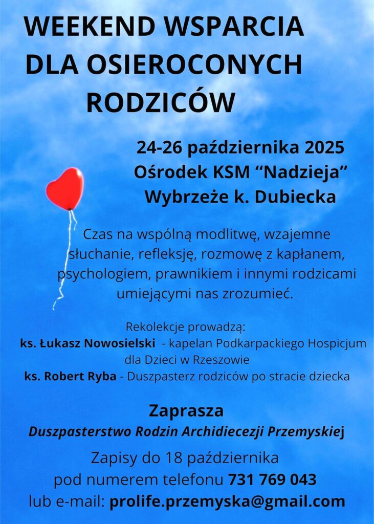 Pod koniec października (24-26.10.2025) w ośrodku rekolekcyjnym „Nadzieja” w Wybrzeżu nieopodal Dubiecka odbędzie się „Weekend Wsparcia dla rodziców po stracie dziecka”. Jest to propozycja dla rodziców, którzy doświadczyli śmierci dziecka w najróżniejszych okolicznościach. W programie rozmowy z psychologiem, prawnikiem i duszpasterzem oraz okazja do modlitwy i dzielenia się doświadczeniami. Spotkanie organizuje Duszpasterstwo Rodzin Archidiecezji Przemyskiej oraz kapelan Podkarpackiego Hospicjum dla Dzieci